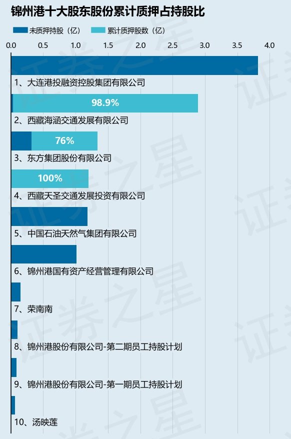 截止本公告日,股东西藏海涵交通发展有限公司已累计质押股份2.86亿股,占其持股总数的98.9%,股东东方集团(600811)股份有限公司已累计质押股份1.02亿股,占其持股总数的76.0%,股东西藏天圣交通发展投资有限公司已累计质押股份1.2亿股,占其持股总数的100.0%。本次质押后锦州港(600190)十大股东的累计质押股份占持股比例见下图: