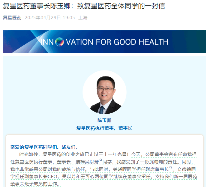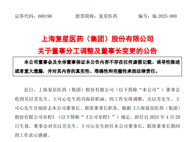 近日,复星医药发布《关于董事分工调整及董事长变更的公告》。