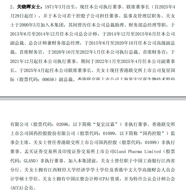 资料显示,关晓晖,现任复星医药执行董事、联席董事长,并于该公司若干控股子公司担任董事、监事及管理层职务。