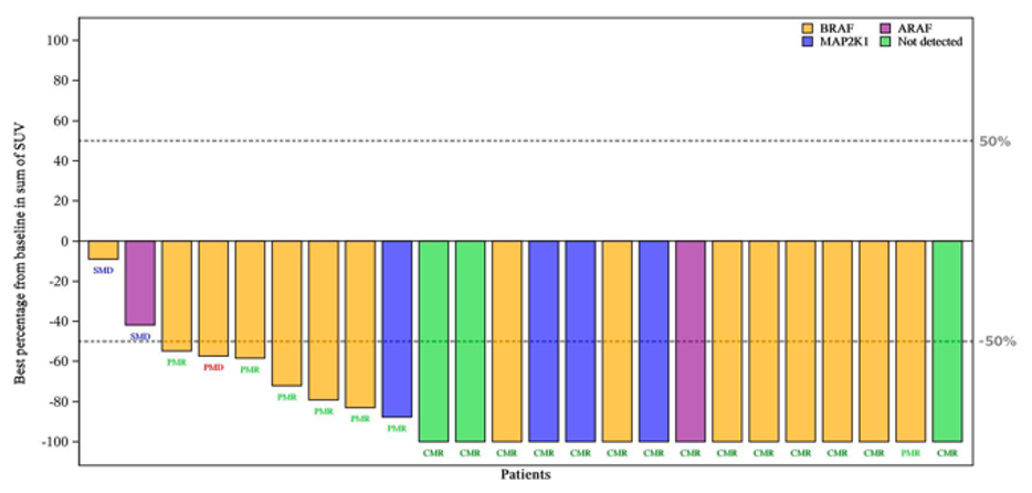 在入组的 25 例患儿中,84%(n=21)的患者在组织或 cfDNA 样本中存在多种 MAPK 通路突变(15例[60.0%] BRAF 突变,2例[8.0%] ARAF 突变,和4 例[16.0%] MAP2K1 突变),其余4例患儿(16%)未检测到基因突变。在BRAF 突变、ARAF 突变、MAP2K1 突变和未发现突变的患儿中,IRC评估的ORR分别为86.7%、50%、100%和75%。