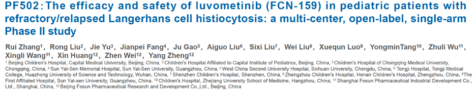 该项多中心、开放标签、单臂、II期研究由首都医科大学附属北京儿童医院的张蕊教授牵头,旨在评估芦沃美替尼用于治疗复发/难治性LCH儿童患者的有效性与安全性。该研究纳入25名复发或难治性LCH儿童患者接受芦沃美替尼单药治疗(剂量 5 mg/m2,每日一次),每28天为一周期。主要终点为由独立评审委员会(IRC)基于PET response criteria (PRC)评估的客观缓解率(ORR),次要终点包括由研究者基于PRC评估的ORR、研究者根据2009年《LCH评估与治疗指南》评估的ORR和安全性等。