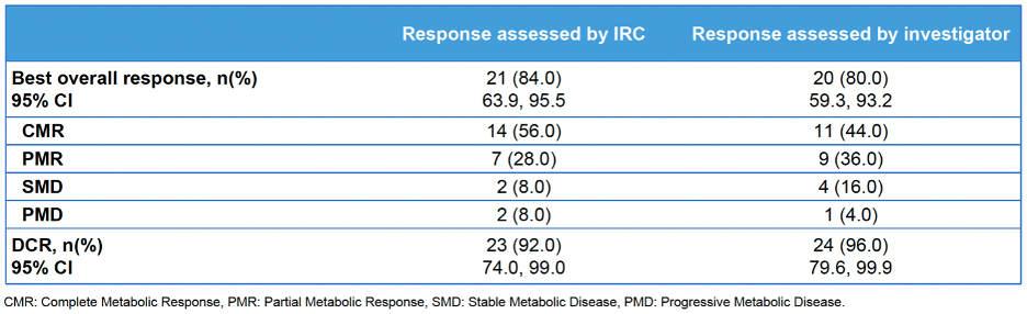 截至2024年11月13日,共有25例患儿入组,中位随访时间为7.4个月。研究结果显示,IRC根据PRC评估的ORR达84.0%(21/25),其中14例为完全代谢缓解(CMR),7例为部分代谢缓解(PMR)。研究者评估的ORR达80.0%(20/25),其中11例为CMR,9例为PMR(表1 图1)。
