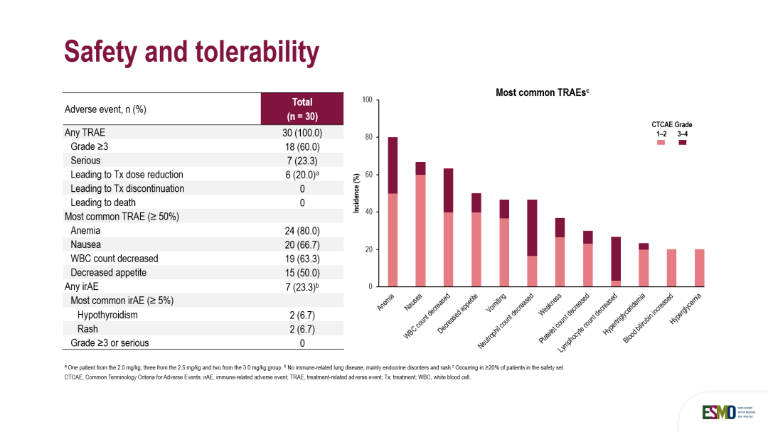 Encouraging preliminary efficacy was observed, with an ORR of 41.4% and DCR of 82.8% in the overall population, rising to 70.0% and 100% in the 3 mg/kg group, alongside a manageable safety profile