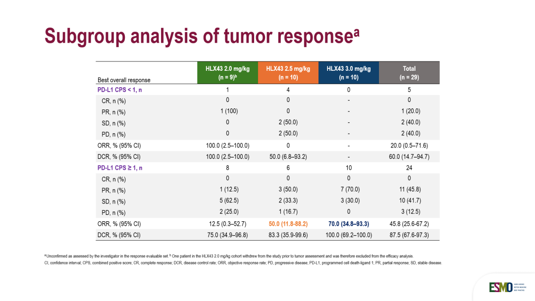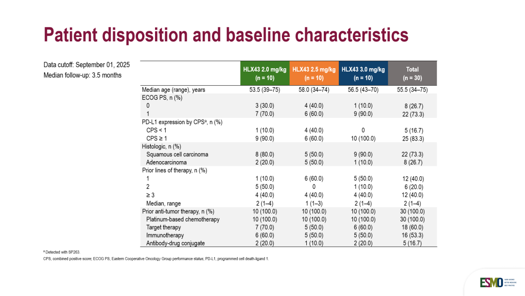 By the data cutoff date of September 1, 2025, 30 patients were enrolled and randomized to receive HLX43 at 2 mg/kg (n=10), 2.5 mg/kg (n=10) and 3 mg/kg (n=10). Over 80% of the patients had a PD-L1 combined positive score ≥ 1. The median line of prior antitumor therapy was 2.0 (range, 1–4). All patients received platinum-based chemotherapy, 60% received targeted therapy, approximately 50% received immunotherapy, and the median follow-up time was 3.5 months.