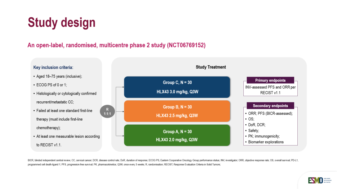 This open-label, randomised, multicentre phase 2 study was led by Academician Jinming Yu from the Shandong Cancer Hospital. Patients with histologically confirmed recurrent/metastatic CC who had previously failed, intolerant to, or contraindicated for standard first-line therapy were randomised 1:1:1 to receive HLX43 at 2 mg/kg, 2.5 mg/kg, or 3 mg/kg every 3 weeks. The primary endpoints were investigator-assessed objective response rate (ORR) and progression-free survival per RECIST v1.1. Secondary endpoints included other efficacy measures, safety, pharmacokinetics, immunogenicity, and biomarker explorations.