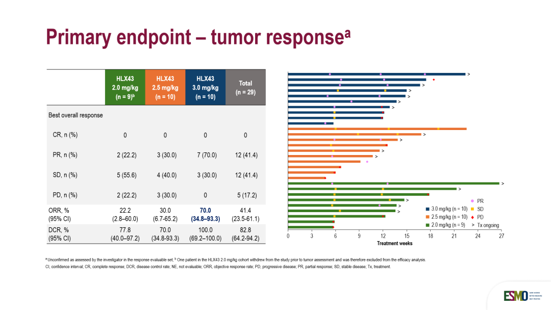 The encouraging efficacy observed across multiple solid tumors corroborates the broad-spectrum anti-tumor potential of HLX43