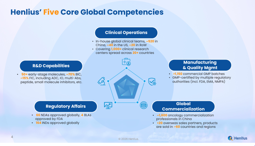 Henlius has established a fully integrated biopharmaceutical platform covering R&D, clinical operations, regulatory affairs, manufacturing and commercialisation. In R&D, the Company has built a diversified pipeline of more than 50 early-stage assets, with approximately 70% classified as best-in-class (BIC) and 15% as first-in-class (FIC). In clinical operations, it operates in-house global clinical teams across China, the United States and other regions, with nearly 600 professionals supporting clinical development in more than 20 countries and over 1000 research centres worldwide, possessing the capability to independently conduct international multicentre clinical trials. In regulatory affairs, the Company has secured a total of 164 IND approvals and 66 New Drug Application (NDA) approvals globally, including 4 Biologics License Application (BLA) approvals from the U.S. FDA, continuously validating its international regulatory and quality management capabilities. In manufacturing and quality, it has completed over 1150 commercial GMP batches, with production facilities certified by regulatory authorities in China, the European Union, the United States and many other countries, providing a strong guarantee for the stable supply of products in the global market. In commercialisation, the company has established a strong oncology-focused commercial team of approximately 1600 professionals in China, while working with more than 20 international commercialisation partners, with its products now marketed in approximately 60 countries and regions.