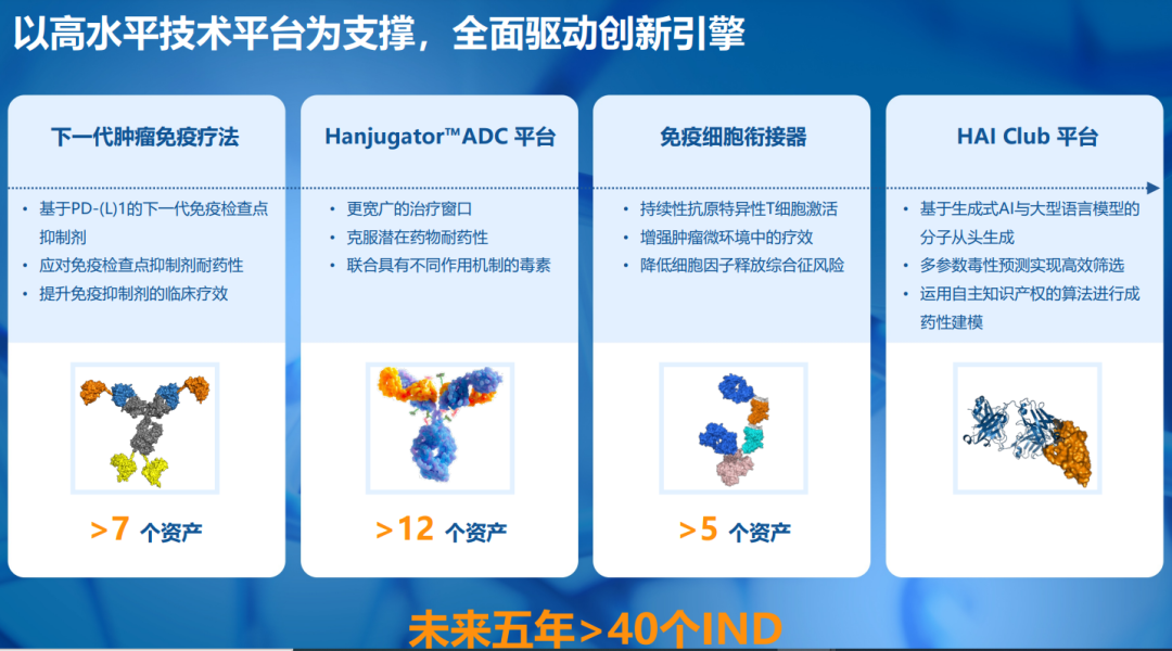 目前,从早期靶点筛选、验证,候选分子设计与优化,到系统性地临床前开发,公司已搭建起包括PD-(L)1为核心的免疫检查点抑制剂平台、免疫细胞衔接器平台(如多特异性TCE平台)、Hanjugator? ADC 平台、AI驱动的一站式早期研发平台HAI Club在内的多维创新平台矩阵,不仅保障了单个项目的研发质量与效率,更关键的是为打造具备全球竞争力的中长期创新管线提供了可持续的系统能力支撑,从而能够持续、高效地将前沿科学发现转化为具有临床价值的候选药物。未来五年内,公司预计将有超过40项新的临床研究申请获批。