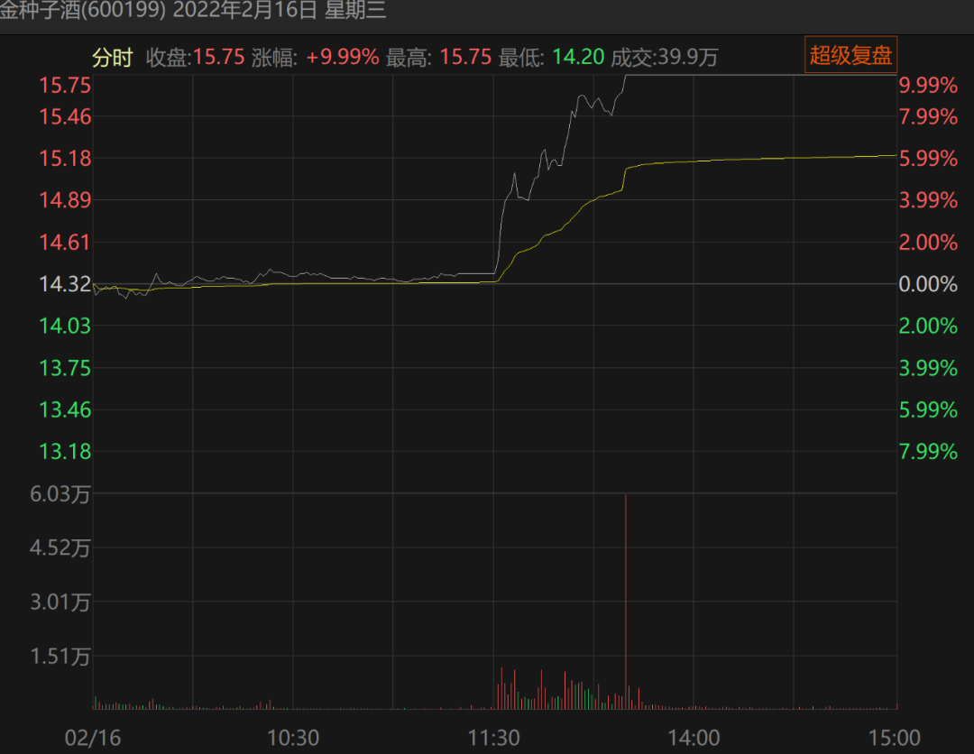 2月16日上午,金种子酒一直走势平稳,丝毫没有大利好的迹象,不过下午刚一开盘股价就直线拉升,最终在13点30分之后被一笔近1亿元的大资金封死涨停板。
