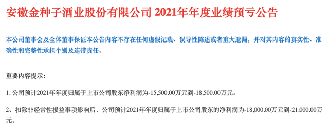 1月29日,金种子酒发布2021年业绩预亏公告称,公司预计2021年年度归属于上市公司股东净利润为-15500.00万元到-18500.00万元;扣除非经常性损益事项影响后,公司预计2021年年度归属于上市公司股东的净利润为-18000.00万元到-21000.00万元。