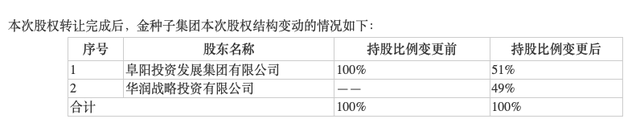 2月16日,金种子酒收到公司控股股东——安徽金种子集团有限公司(以下简称:金种子集团)的通知,为推动国有企业深化改革和高质量发展需要,公司控股股东金种子集团唯一股东阜阳投资发展集团有限公司(以下简称“阜阳投发”)拟按照《企业国有资产交易监督管理办法》等法律法规以非公开协议转让方式将所持金种子集团49%的股权转让给华润(集团)有限公司之全资附属企业华润战略投资有限公司(以下简称“华润战投”)。本次交易后,控股股东引入重要战略股东,双方进行长期合资合作。本次交易不会导致公司控股股东和实际控制人变更,公司控股股东仍为金种子集团、实际控制人仍为阜阳市国资委。