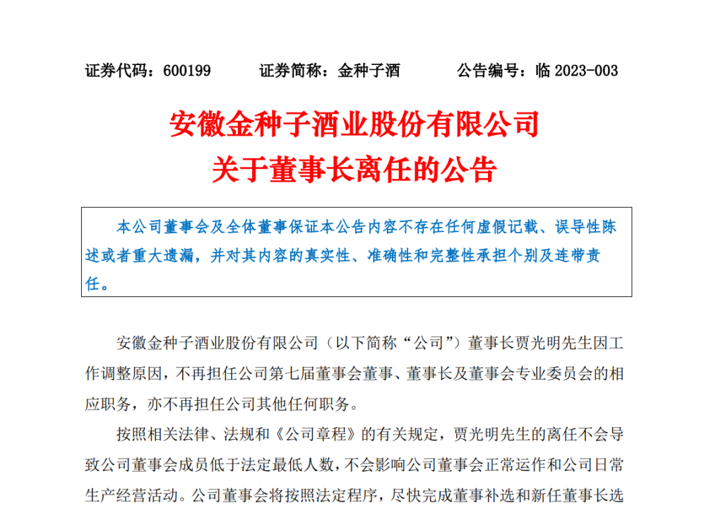 2月22日下午,金种子酒发布公告称,公司董事长贾光明因工作调整原因,不再担任公司第七届董事会董事、董事长及董事会专业委员会的相应职务,亦不再担任公司其他任何职务。公司董事会将按照法定程序,尽快完成董事补选和新任董事长选举等相关后续工作。