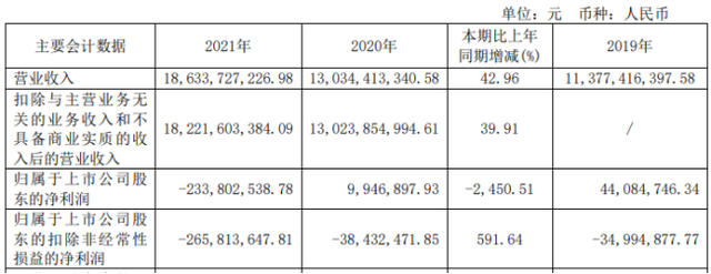 集微网消息,4月28日,福日电子发布2021年年度报告,实现营业收入186.34亿元,同比增长42.96%;归属于上市公司股东的净利润亏损2.34亿元,同比减少2450.51%,上年同期为盈利994.69万元;归属于上市公司股东的扣除非经常性损益的净利润亏损2.66亿元,上年同期为亏损3843.25万元;基本每股亏损0.4998元。