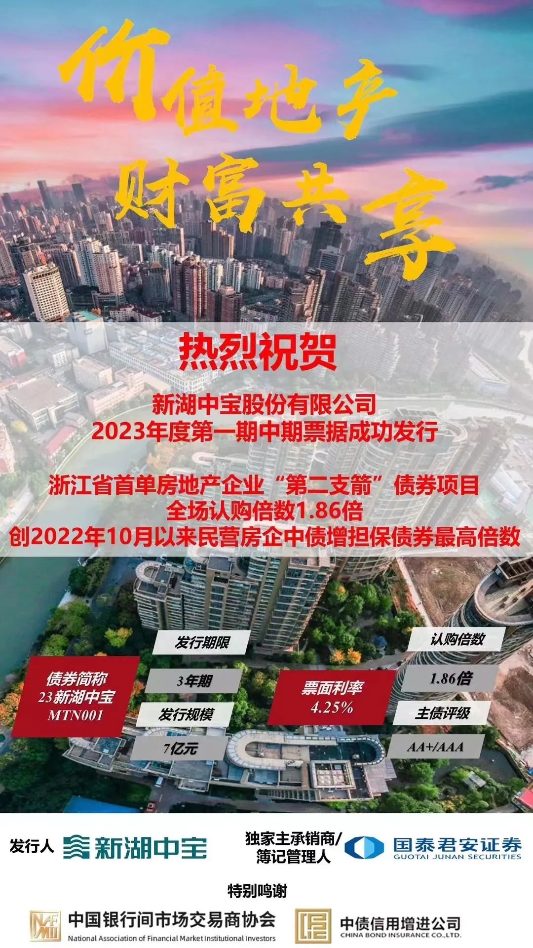 7月13日,新湖中宝股份有限公司2023年度第一期中期票据(债券简称:23新湖中宝MTN001,债券代码:102381663)在银行间市场成功发行,本期中期票据由国泰君安证券担任独家主承销商,由中债信用增进公司提供全额无条件不可撤销的连带责任保证担保。