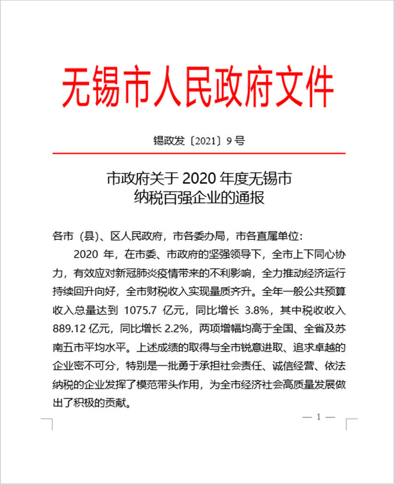 无锡市政府通报称,为营造奋勇争先、诚信纳税的良好氛围,进一步增强企业纳税责任感、使命感、荣誉感,经研究决定,对2020年度无锡市纳税百强企业进行通报表扬。