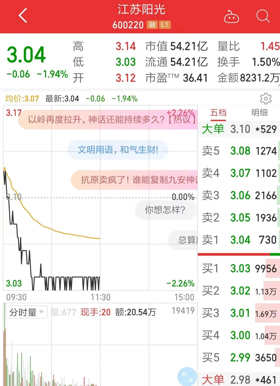 公告发出后,江苏阳光股价接近涨停开盘,但之后全天低走,收盘涨幅收窄至3%。