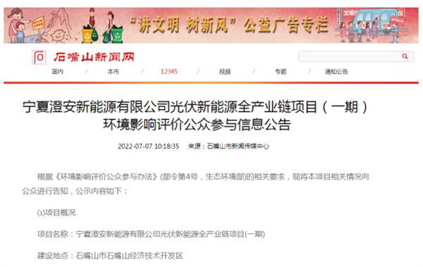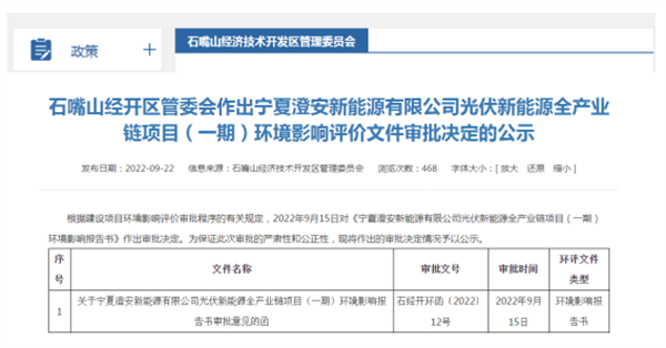 2022年9月15日,石嘴山经开区管委会作出宁夏澄安新能源有限公司光伏新能源全产业链项目(一期)环境影响评价文件审批决定,审批文号为石经开环函〔2022〕12号。