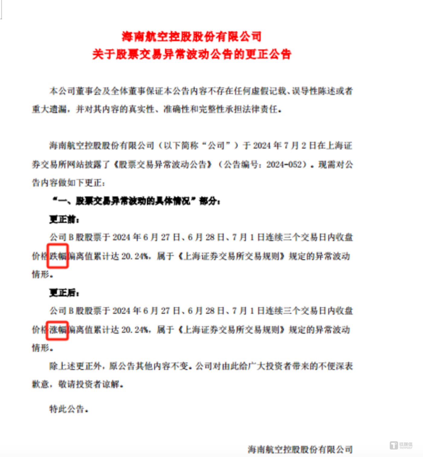 有意思的是,7月2日,海航控股发布更正公告,6月27日、6月28日、7月1日公司连续三个交易日内收盘价格涨幅偏离值累计达20.24%写成了跌幅,如此手忙脚乱地发布公告实属罕见。