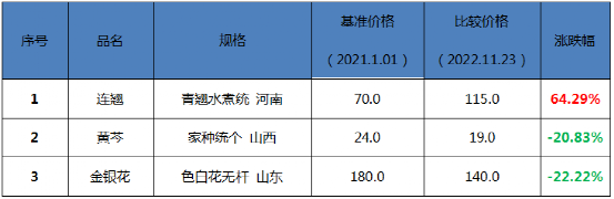 双黄连口服液核心原料在2021年1月-2022年11月期间,1种原料品种价格上涨,占比33.3%,2种原料价格下跌,占比66.7%。