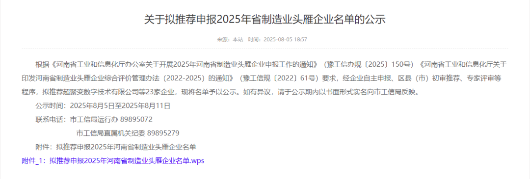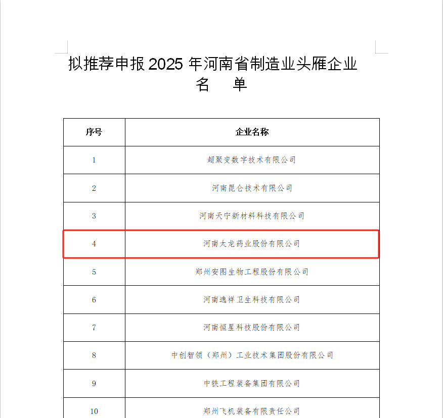 近日,河南省工业和信息化厅公示了“拟推荐申报2025年河南省制造业头雁企业名单”。名单中显示,河南太龙药业股份有限公司入选“拟推荐申报2025年河南省制造业头雁企业名单”。