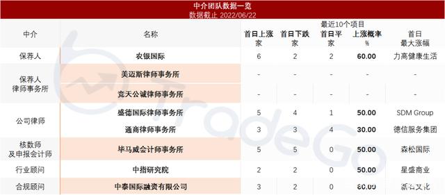 据捷利交易宝数据统计,鲁商生活中介团队共计8家,其中保荐人共计1家,近10家保荐项目数据表现较好;公司律师共计2家,综合项目数据一般。整体而言中介团队历史数据表现尚可。