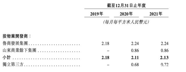 2021年按每月每平米计算,来至于鲁商发展集团的物业费较高,为2.24,且有一定增幅。而来自第三方的较低,为0.72。公司从2020年开始有外拓部分的收入,但是外拓部分的收费单价较低。