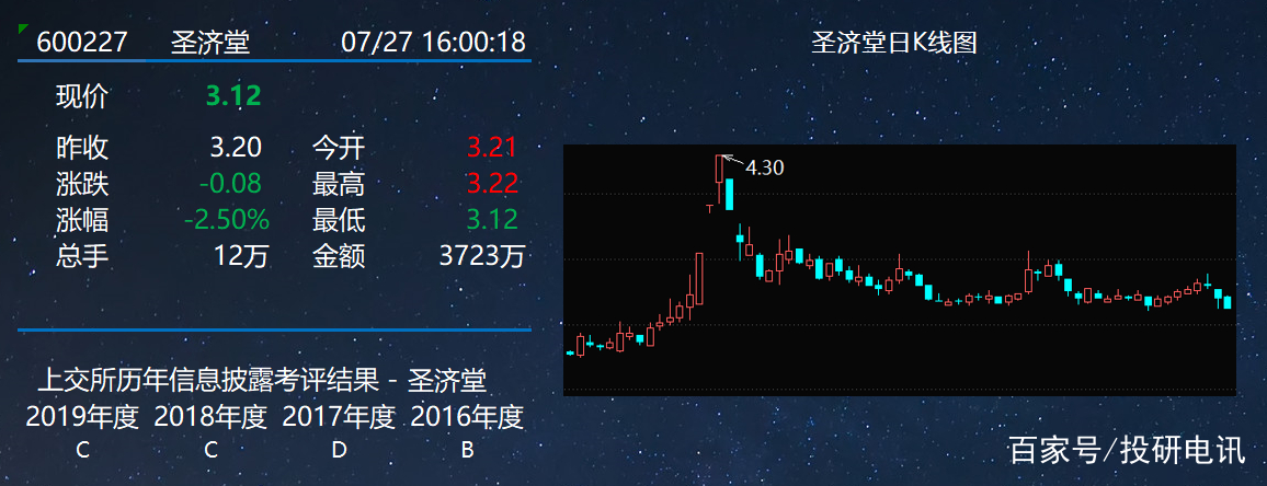 据投研电讯信披质量研究院统计,自上交所在2016年度开展信息披露考评以来,近4年,圣济堂的信息披露考评1次为B、2次为C,1次为D,近3年,圣济堂年度信披考评非C即D。