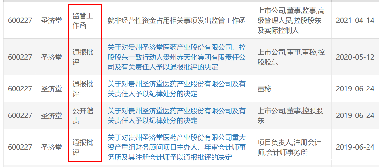 投研电讯信披质量研究员注意到,2021年4月14日,因非经营性资金占用相关事项,圣济堂、公司董监高、控股股东及实际控制人收到上交所监管工作函;2020年5月12日,因圣济堂为关联方提供担保的实际期限超过前期经股东大会审议并披露的期限,相关超期担保未履行审议程序和相关信息披露义务,公司为关联方向银行贷款承担担保义务实际长达5年,远远超出股东大会审议通过的不超过1年的担保期限,上交所决定对圣济堂及其控股股东一致行动人赤天化集团、圣济堂时任董事长周俊生、时任财务总监兼董事会秘书吴善华予以通报批评;2019年6月24日,因公司财务信息披露不真实、不准确、未充分披露关联资产出售事项重大风险和后续进展、未披露化工子公司被责令停产事项等违规行为,上交所决定对圣济堂、实际控制人暨时任公司董事长丁林洪、贵州渔阳贸易有限公司予以公开谴责,对时任董事会秘书兼财务总监吴善华予以通报批评。