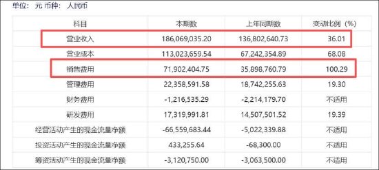 2025年上半年,公司营业收入约1.86亿元,同比增加36.01%;归属于上市公司股东的净利润亏损约3328万元;基本每股收益亏损0.0794元。需要指出的是,公司的销售费用显著高于营收,营收增速为36%,而销售费用增速高达100%。在公司保壳压力下,公司是否利用销售推高营收规模保壳?