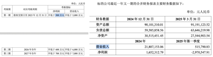 同时,本次交易设置业绩考核条款,考核周期为2025年至2027年,要求标的公司营收分别不低于 5000万元、6000万元、7000万元;净利润则不低于500万元、600万元、700万元。
