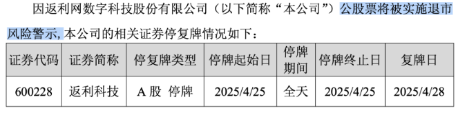 由于公司2024年净利润为负值且营业收入低于3亿元,公司股票于今年4月28日起被实施退市风险警示,股票简称由“返利科技”变更为“*ST返利”。