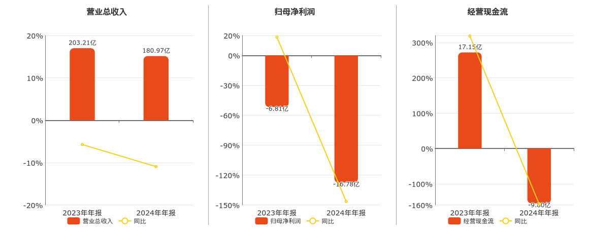 公司营业总收入为180.97亿元,较去年同报告期营业总收入减少22.24亿元,同比较去年同期下降10.94%。归母净利润为-16.78亿元,较去年同报告期归母净利润减少9.97亿元。经营活动现金净流入为-9.80亿元,较去年同报告期经营活动现金净流入减少26.95亿元,同比较去年同期下降157.15%。