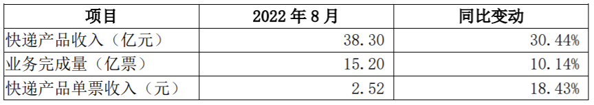 2022年8月,公司实现快递产品收入38.3亿元,同比增长30.44%;业务完成量为15.2亿票,同比增长10.14%;快递产品单票收入为2.52元,同比增长18.43%。