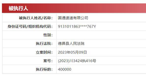 中国执行信息公开网消息,圆通速递有限公司(下称:圆通有限)5月9日新增一则被执行人信息,执行标的40万,执行法院德昌县人民法院,案号为(2023)川3424执416号。