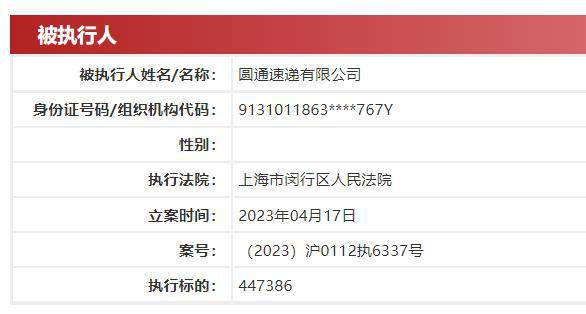 此外,中国执行信息公开网显示,2023年4月17日圆通有限被上海市闵行区人民法院强制执行44.74万,案号为(2023)沪0112执6337号。