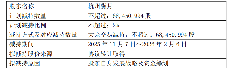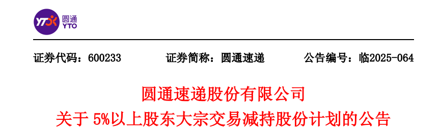 10月16日晚间,圆通速递(600233.SH)宣布,股东杭州灏月计划自公告披露之日起15个交易日后的3个月内,通过大宗交易方式减持公司股份不超过6845.1万股,减持比例不超过公司总股本的2%。截至公告披露日,杭州灏月持有公司3.1亿股,占公司总股本的9.06%。