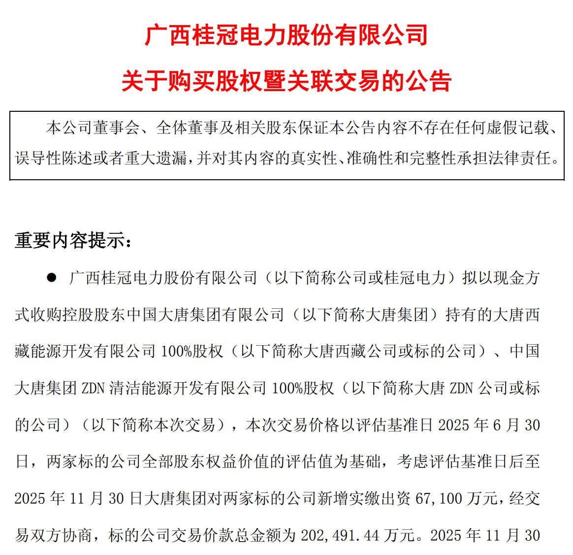 另外,评估基准日至2025年11月30日,大唐集团向两家标的公司新增实缴出资合计6.71亿元,经双方协商一致,本次关联交易总价为20.25亿元。