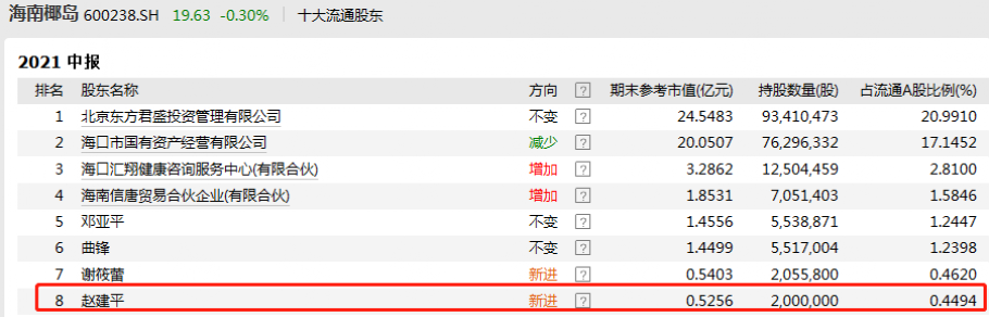 三季度还有一个知名度较高的个人股东撤退,即牛散赵建平。海南椰岛发布的半年报显示,赵建平进入公司前十大流通股东名单,报告期末共持有200万股。
