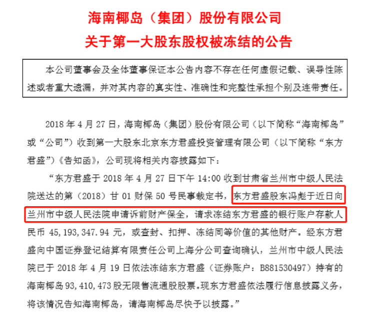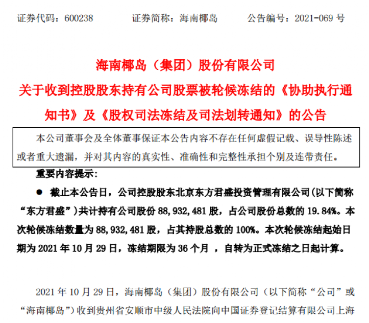10月31日晚间,海南椰岛公告,控股股东东方君盛新增一笔法院轮候冻结,其持有的全部海南椰岛股份自10月29日起被冻结,期限36个月。这至少是东方君盛自2018年4月以来现身的第八个债权人。
