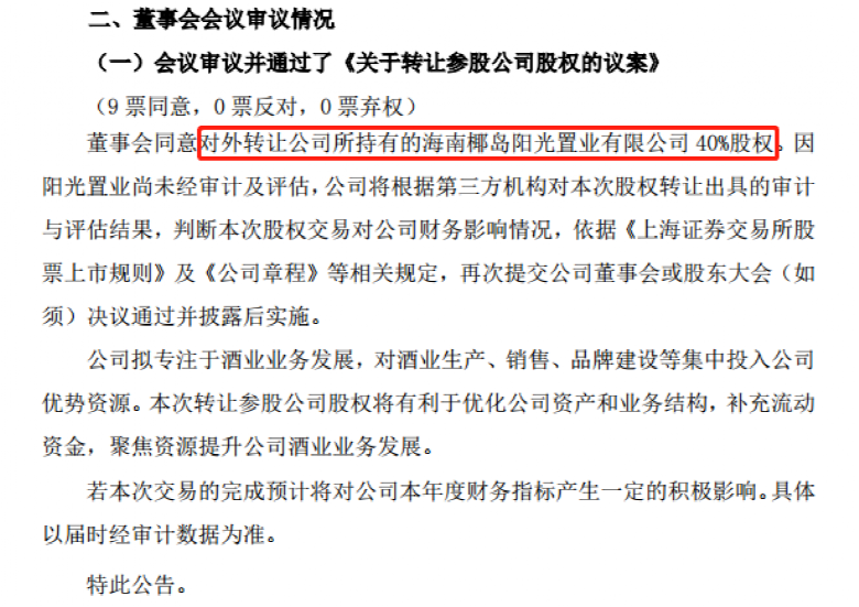 半个月前,海南椰岛公告转让主要房地产子公司阳光置业40%股权,“拟专注于酒业业务发展,对酒业生产、销售、品牌建设等集中投入公司优势资源”。该笔资产出售如在年内完成,有望贡献投资收益,减少亏损甚至扭亏。