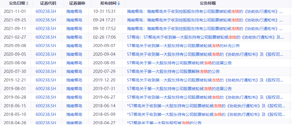 海南椰岛10月31日晚间发布公告称,2021年10月29日,公司收到贵州省安顺市中级人民法院向中国证券登记结算有限公司上海分公司出具的《协助执行通知书》及中国证券登记结算有限公司上海分公司出具的《股权司法冻结及司法划转通知》。