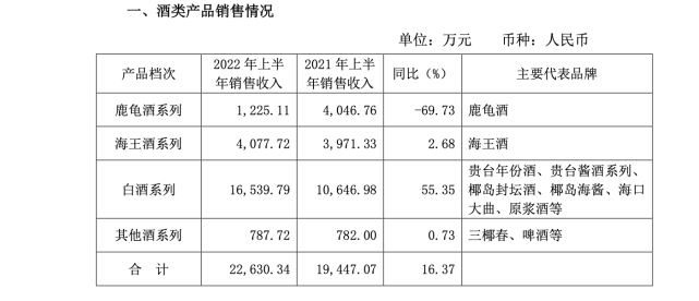 2022年上半年,公司酒类产品实现收入2.26亿元,同比增加16.37%。其中,白酒产品实现收入1.65亿元,同比增长55.35%。