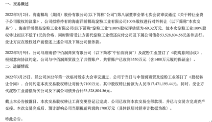 海南椰岛在近期还挂牌转让海南椰岛阳光置业有限公司(下称“阳光置业”)40%股权的公告,转让底价为20686.74万元,披露结束日期2022年9月1日。本次交易,股权转让对价为7100万元,其中股权转让价款为人民币1747.12万元,同时,受让方代淀粉工业清偿所欠公司及下属公司债务合计5352.88万元。