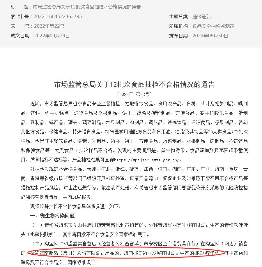 国家市场监管总局9月30日发布《关于12批次食品抽检不合格情况的通告》提到,淘宝网仁和盛酒类自营店(经营者为江西省萍乡市安源区金字塔贸易商行)在淘宝网(网店)销售的、标称海南椰岛(集团)股份有限公司出品的、海南椰岛酒业发展有限公司生产的椰岛?鹿龟酒,其中霉菌和酵母数不符合食品安全国家标准规定。