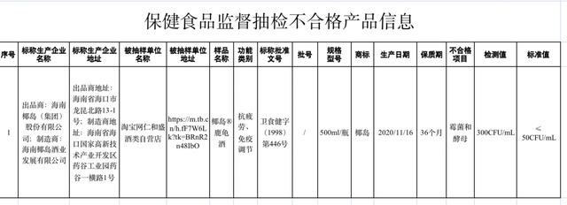 9月30日,市场监管总局发布了《关于12批次食品抽检不合格情况的通告》,通告提到,淘宝网仁和盛酒类自营店(经营者为江西省萍乡市安源区金字塔贸易商行)在淘宝网(网店)销售的、标称海南椰岛(集团)股份有限公司出品的、海南椰岛酒业发展有限公司生产的椰岛鹿龟酒,其中霉菌和酵母数不符合食品安全国家标准规定。