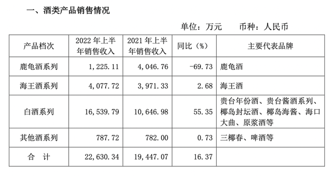据了解,2021年度海南椰岛鹿龟酒销售收入6928.31万元,占公司年度酒类营业收入的20.57%。2022年上半年公司鹿龟酒销售收入1225.11万元,同比减少69%,占公司2022年上半年酒类营业收入的5.41%。