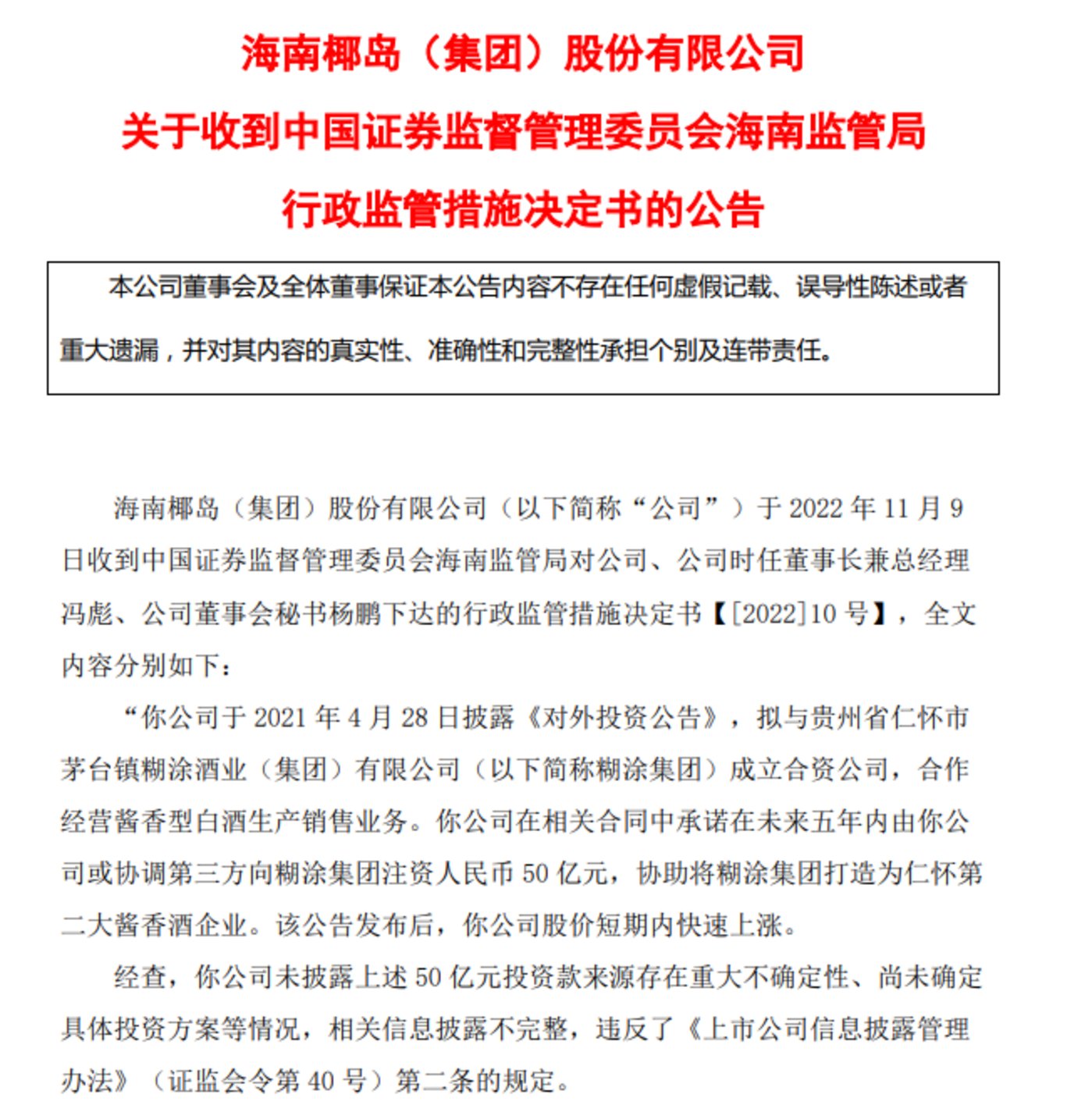 日前,海南椰岛(600238.SH)收到证监会的行政监管“罚单”,去年4月发布的《对外投资公告》中提出“在未来五年内由你公司或协调第三方向糊涂集团注资人民币 50 亿元,协助将糊涂集团打造为仁怀第二大酱香酒企业”,公司未披露上述 50 亿元投资款来源存在重大不确定性、尚未确定具体投资方案等情况,相关信息披露不完整,违反了《上市公司信息披露管理办法》(证监会令第 40 号)第二条的规定。