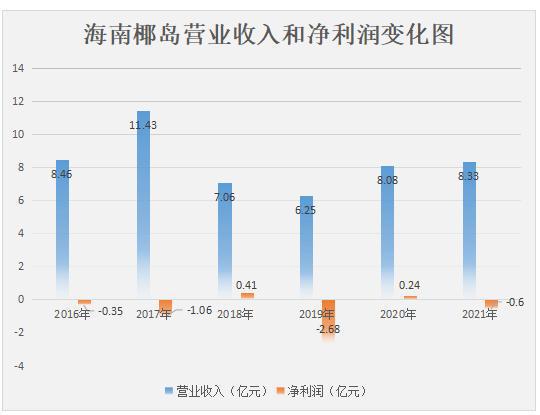 2016-2021年,海南椰岛的营业收入分别为8.46亿元、11.43亿元、7.06亿元、6.25亿元、8.08亿元、8.33亿元;净利润分别为-3525.01万元、-1.06亿元、4051.33万元、-2.68亿元、2430.88万元、-6014.09万元。