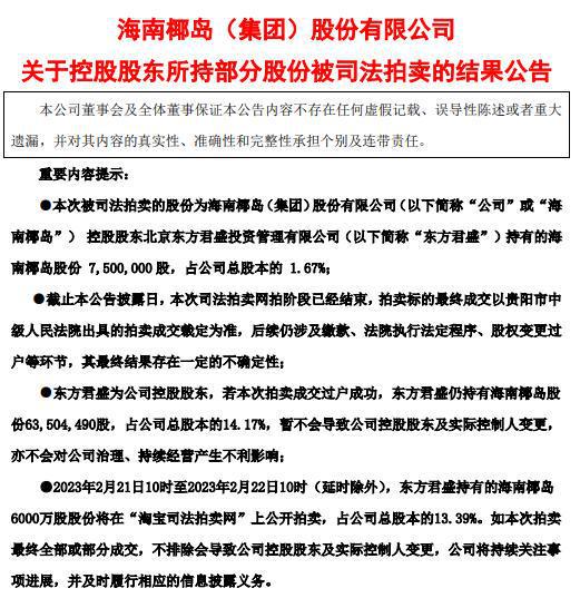 来源:海南椰岛关于控股股东所持部分股份被司法拍卖的结果公告