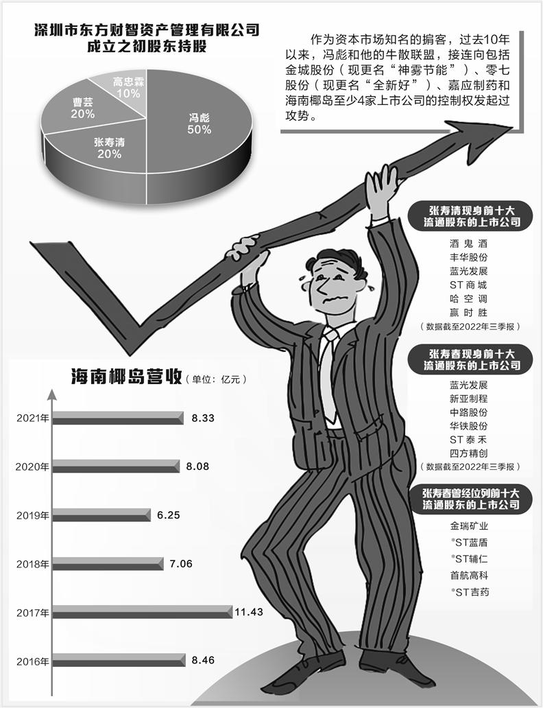 自2012年以来,冯彪和他的牛散联盟,接连向包括金城股份(现更名“神雾节能”)、零七股份(现更名“全新好”)、嘉应制药和海南椰岛至少4家上市公司的控制权发起过攻势。